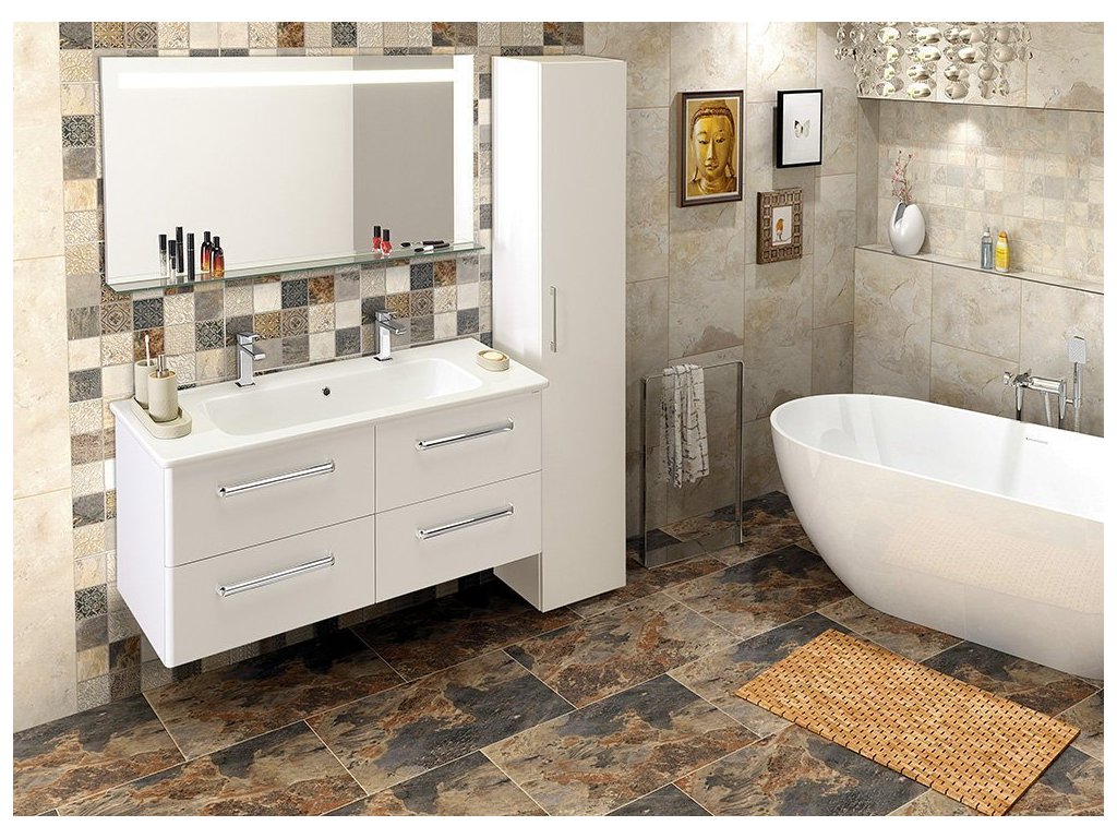 Podsvícená zrcadla osvětlují koupelnu jasným homogením svitem díky modernímu zdroji LED. Jejich dlouhá životnost a nízká spotřeba jsou hlavními výhodami oproti klasické zářivce. Světlo vyzařované skrz vypískované části dodá koupelně jemné osvětlení, zvláště příjemné při ranní hygieně. Zároveň jistě oceníte i praktickou polici, která je součástí zrcadla.