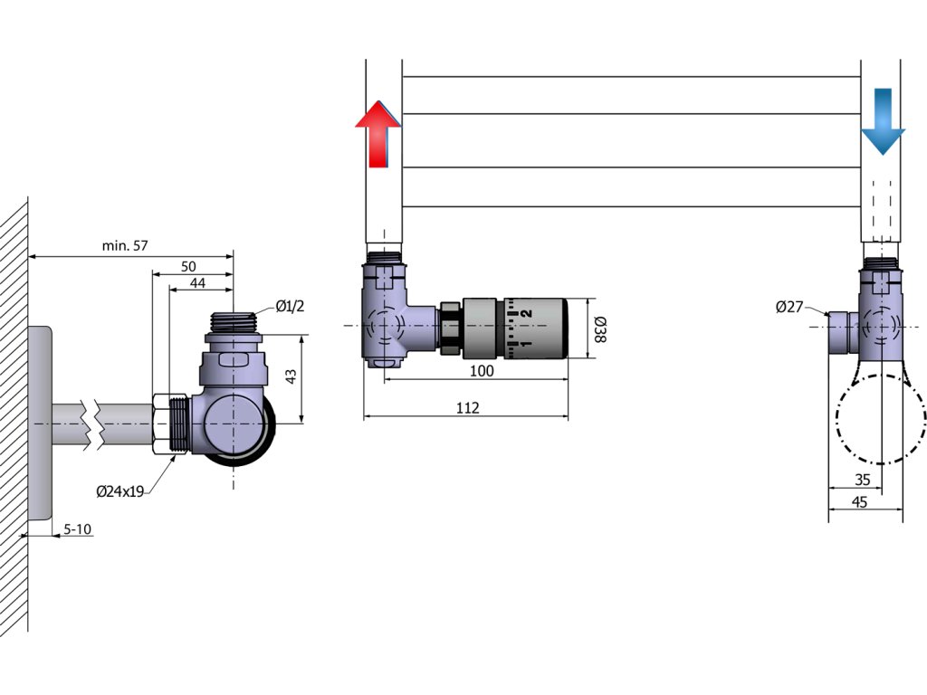 Ventil s termostatickou hlavicí: Integrovaný termostat udržuje nastavenou teplotu okolí. Termostatická hlavice musí být v místě přívodu teplé vody (mimo MONO ONE).