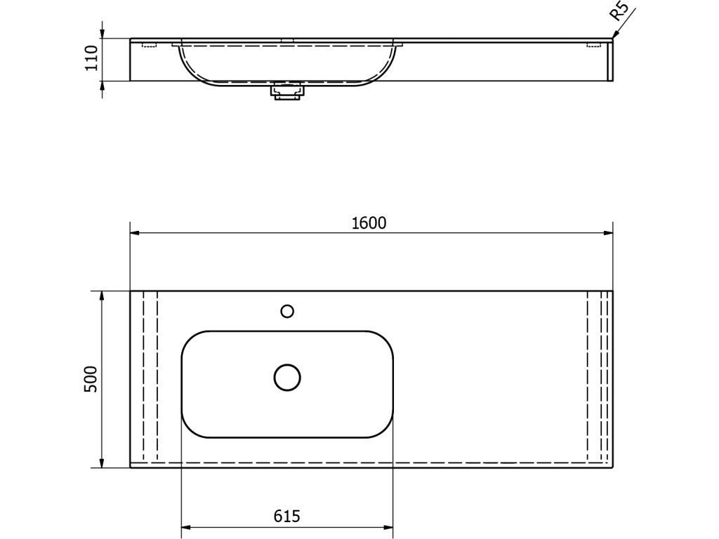 Zátka umyvadlové výpusti je vyrobena ze stejného materiálu jako umyvadlo. V otevřené poloze je zátka v jedné rovině se dnem umyvadla. Umyvadlo lze umístit i do vyzděné niky. Doporučujeme instalovat každých 70 cm podpěrnou konzoli.