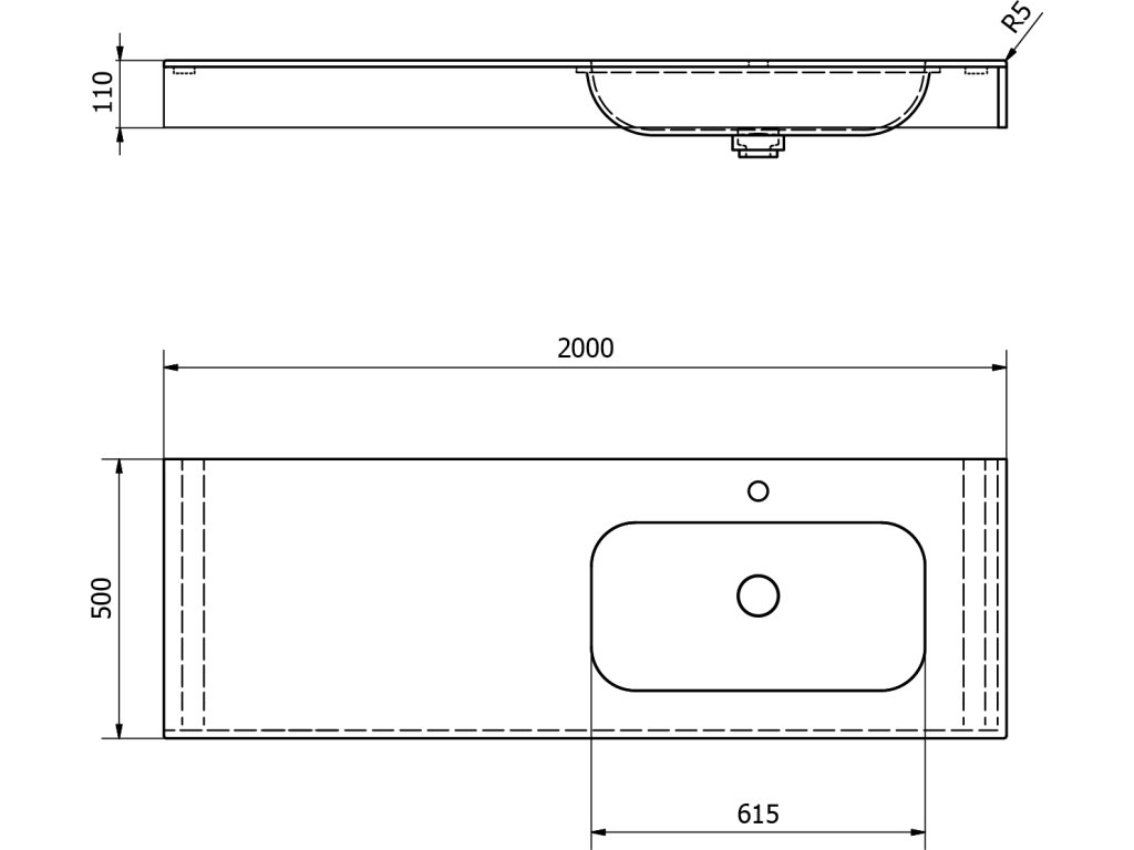 Zátka umyvadlové výpusti je vyrobena ze stejného materiálu jako umyvadlo. V otevřené poloze je zátka v jedné rovině se dnem umyvadla. Umyvadlo lze umístit i do vyzděné niky. Doporučujeme instalovat každých 70 cm podpěrnou konzoli.