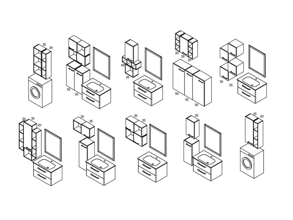 Skříňky nabízíme v barevném provedení a dekorech lamina se strukturou dle vzorníku. K některým skříňkám lze dokoupit samostatnou vnitřní zásuvku, případně vyjímatelný a pratelný látkový prádelní koš na suchý zip. Skříňky lze instalovat jak s levým, tak s pravým otvíráním dvířek – pouhým otočením dvířek o 180° získáme potřebnou variantu.