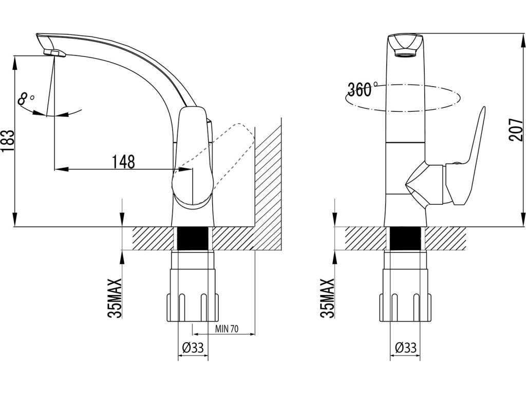 Systém úspory spotřeby vody a energie: V základní poloze vytéká studená voda, postupným otáčením páky doleva se přidává voda teplá. Průtok vody je regulován zvednutím páky baterie.