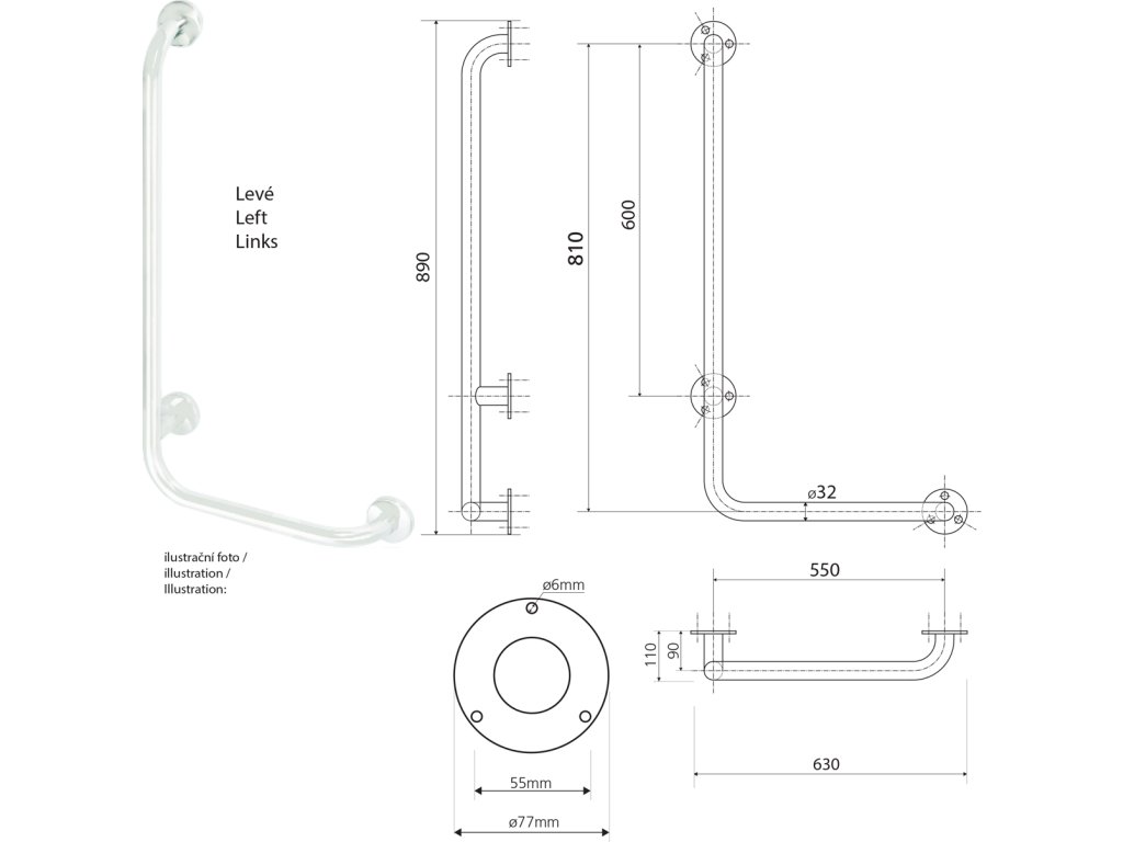 K uchycení jsou dodávány nerez šrouby podle DIN 95, 6×60 mm s hmoždinkami z plastu pro montáž do plných cihel a betonu.