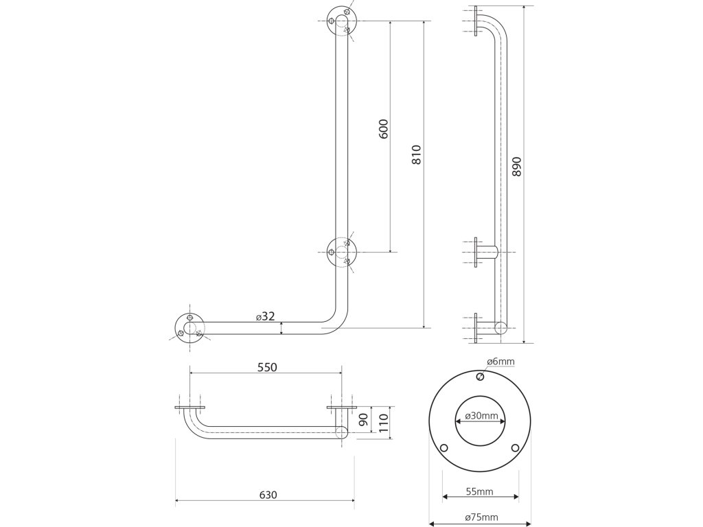 Sapho HANDICAP nástěnné madlo PRAVÉ 810x550mm, nerez lesk XH524