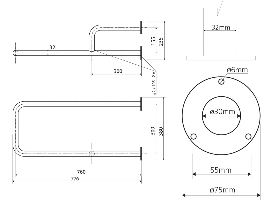 K uchycení jsou dodávány nerez šrouby podle DIN 95, 6×60 mm s hmoždinkami z plastu pro montáž do plných cihel a betonu.
