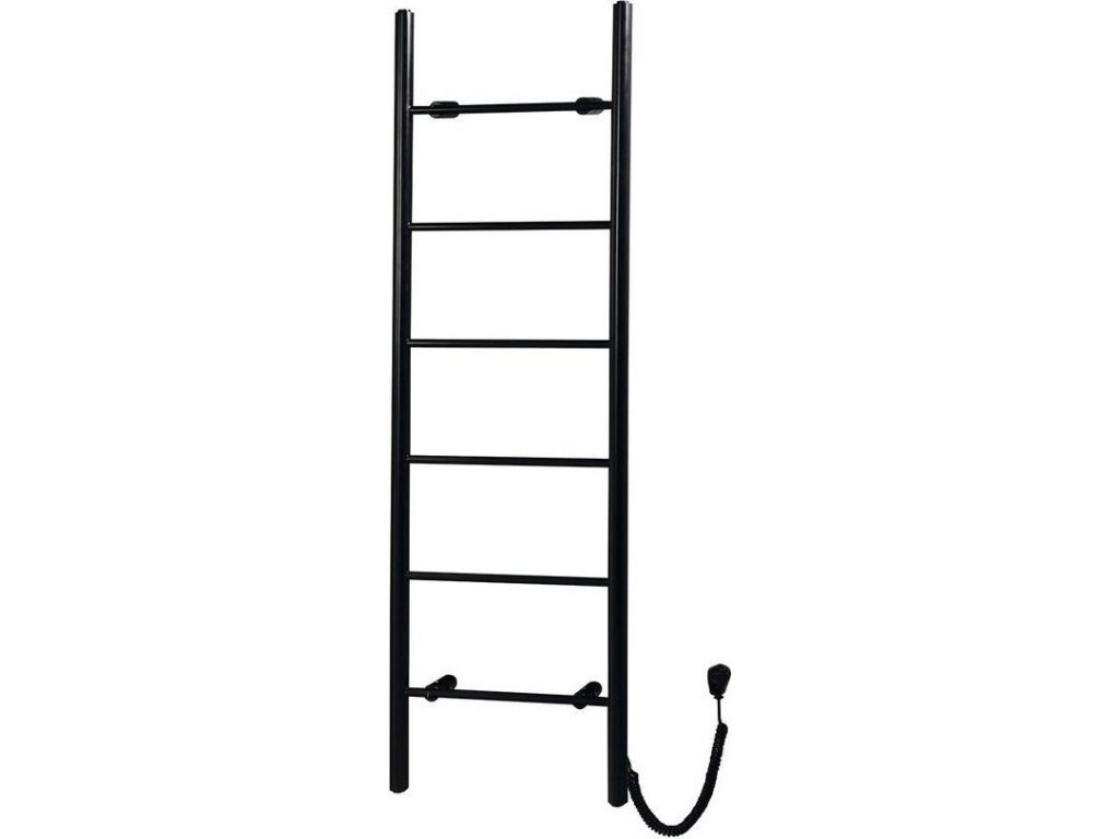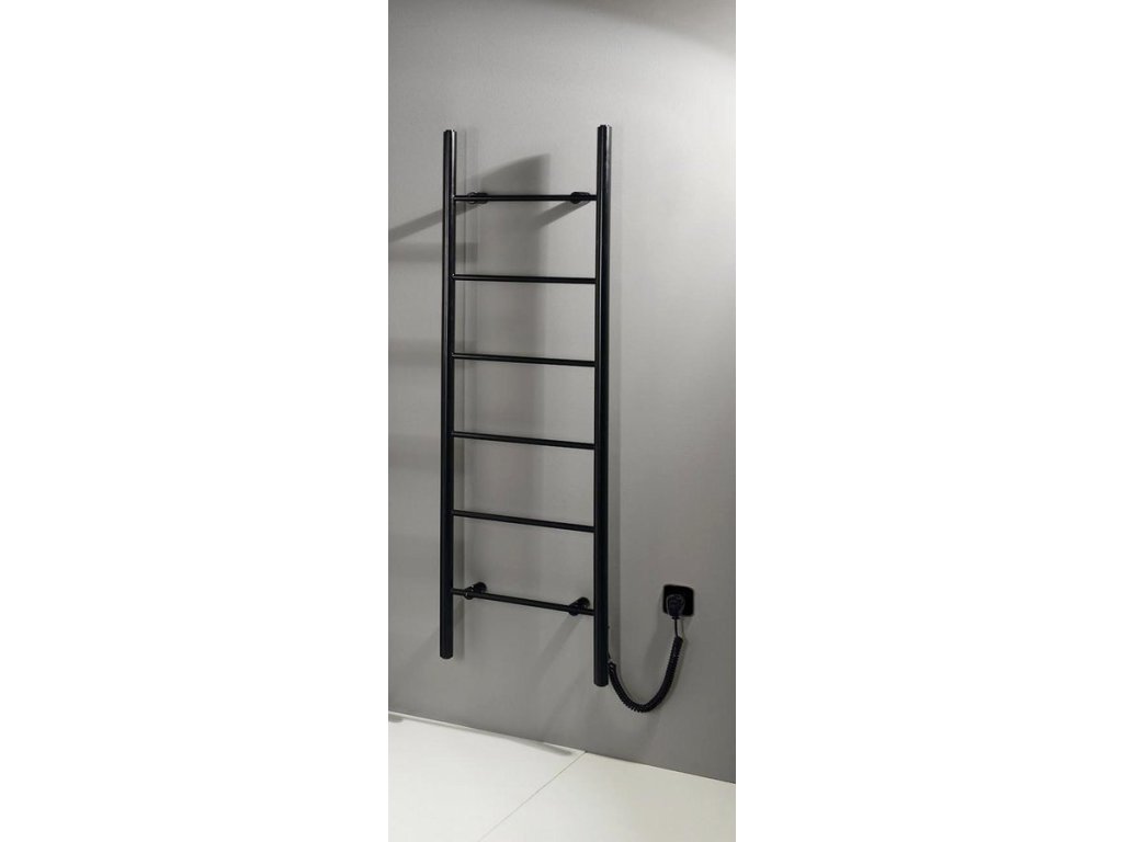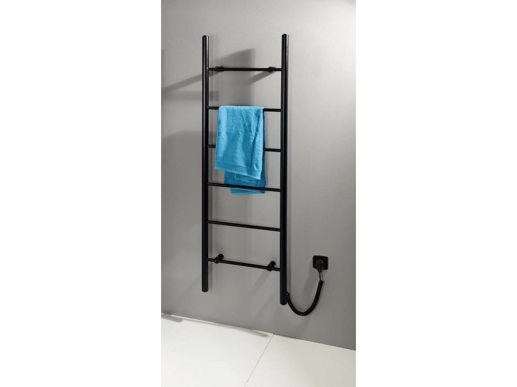 Soubory ke stažení:Elektrický sušák ručníků do moderního interiéru - v matně černé barvě jsou nejen trubky a uchycení, ale i napájecí kabel a elektrická zástrčka.