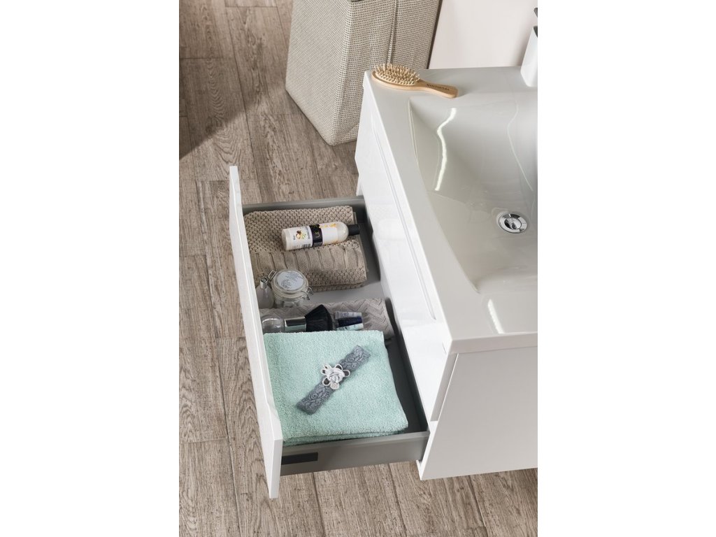 Nábytek je vybaven pojezdy zásuvek s pomalým dojezdem a systémem automatického dovření zásuvek. Již žádné hlučné dovírání.