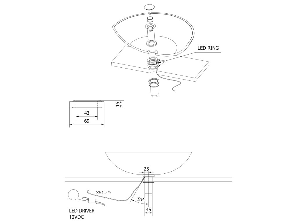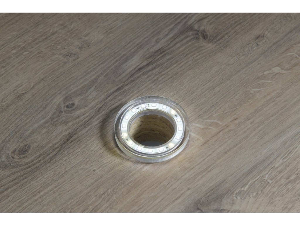 Světelný kroužek má na obou stranách průhledné těsnění a jednoduše se instaluje na odpad umyvadla. Je vyroben z průhledného akrylátu a vyzařuje světlo směrem do umyvadla a pod umyvadlo.