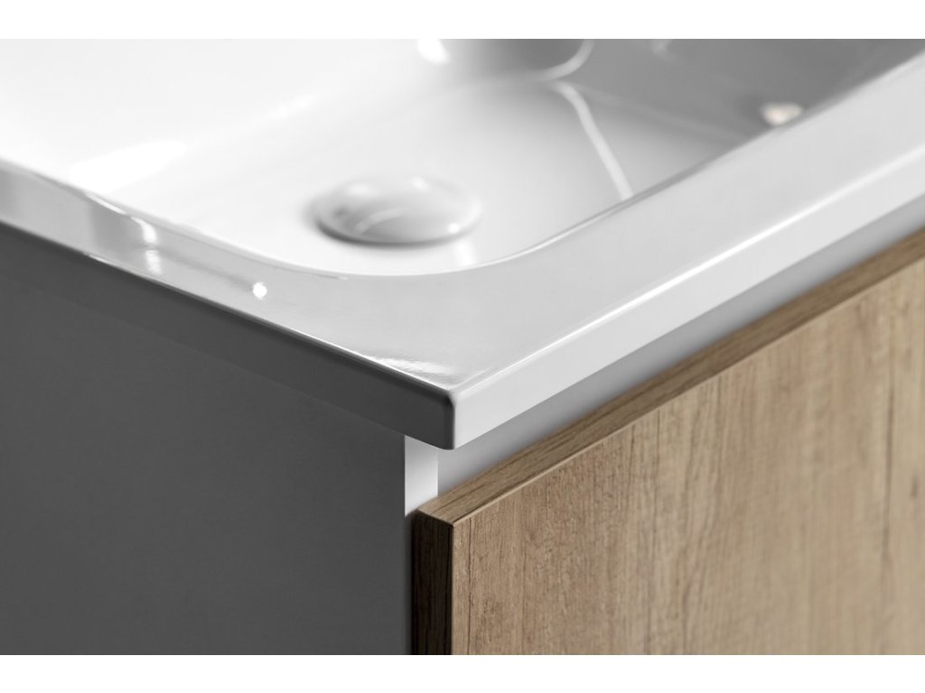 Uvnitř skříňky je nad zásuvkou praktická police na drobnosti každodenní potřeby. Pod hranu umyvadla lze instalovat tlumené LED osvětlení, které pro jeho nízkou spotřebu (1W) není nutné vypínat.