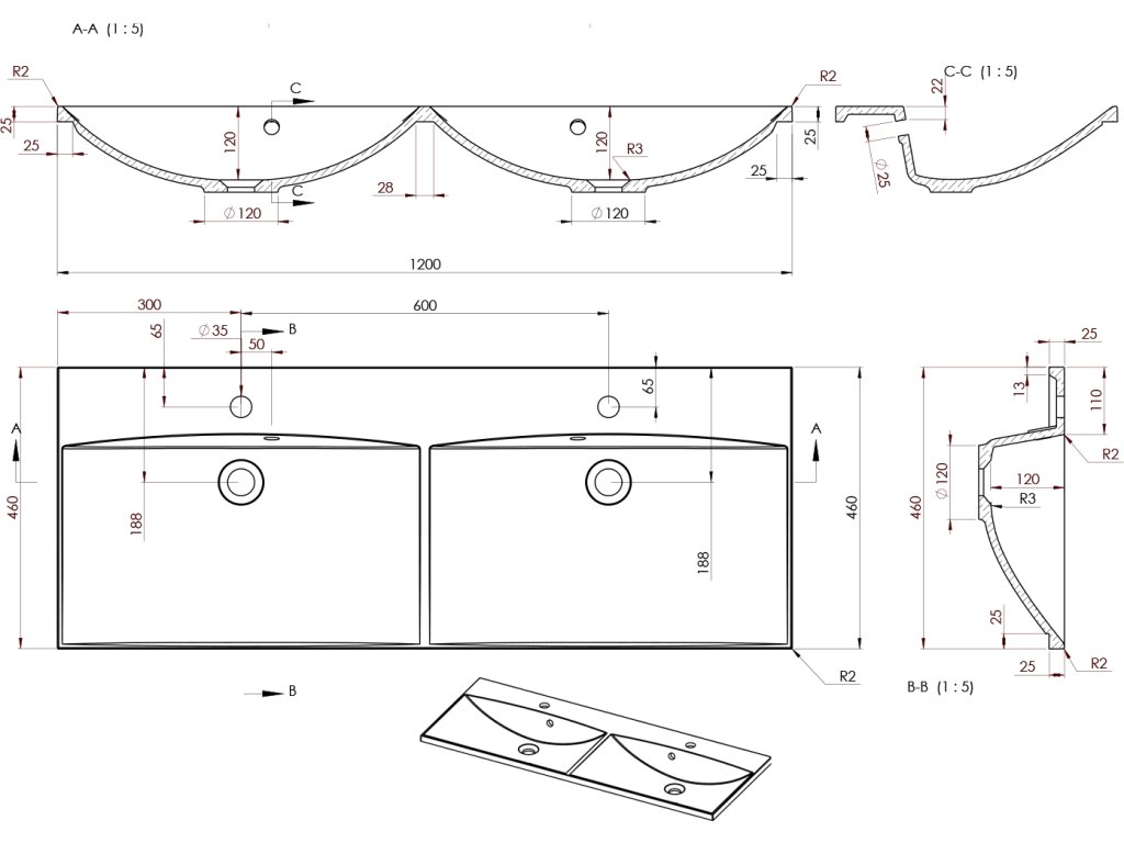 Sapho MARIA dvojumyvadlo, litý mramor, 120x46cm, bílá MA120