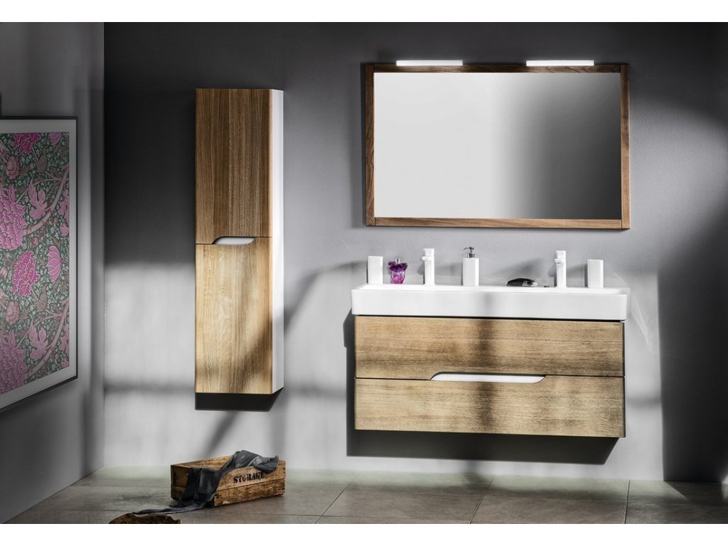 Série MEDIENA je kombinací bílé matné barvy a zásuvek z masivního dřeva, které svým zaoblením kopírují tvar keramických umyvadel SAND od italského výrobce GSI. Zásuvky s netradičním tvarem výřezu pro otvírání jsou vybaveny výsuvy BLUM s funkcí tlumení BLUMOTION s doživotní zárukou. Skříňky nabízíme buď celé v bílém matném provedení nebo v kombinaci korpus matná bílá a čela zásuvek ve 2 dekorech dubového dřeva (voskový olej dub natural a dub graphite). Šířky skříněk jsou 60, 80, 100 a 120 cm. V nabídce jsou též 2 typy doplňkových policových skříněk. Skříňku s prádelním košem získáte jednoduchým vyjmutím spodní police u doplňkové skříňky šíře 35 cm a instalací látkového prádelního koše na suchý zip.