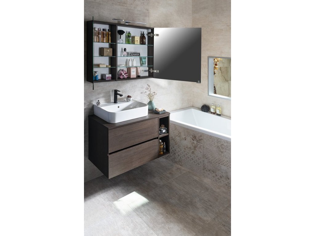 Galerky MIRRÓ - další krok k dokonalému designu. Vnitřní prostor galerek se skleněnými nastavitelnými policemi poskytuje dostatek místa pro uskladnění kosmetiky, hygienických potřeb i holicího strojku. Navíc i při otevření galerky můžete používat zrcadlo díky oboustranným zrcadlovým dvířkům. Dovírání dvířek s dotahem zajišťuje značkové kování BLUM s doživotní zárukou. Výkonné LED osvětlení, elektrická zásuvka a designová úchytka dvířek již jen doplňují funkčnost a praktičnost. Navíc lze galerky kombinovat s otevřenými policemi RIWA.