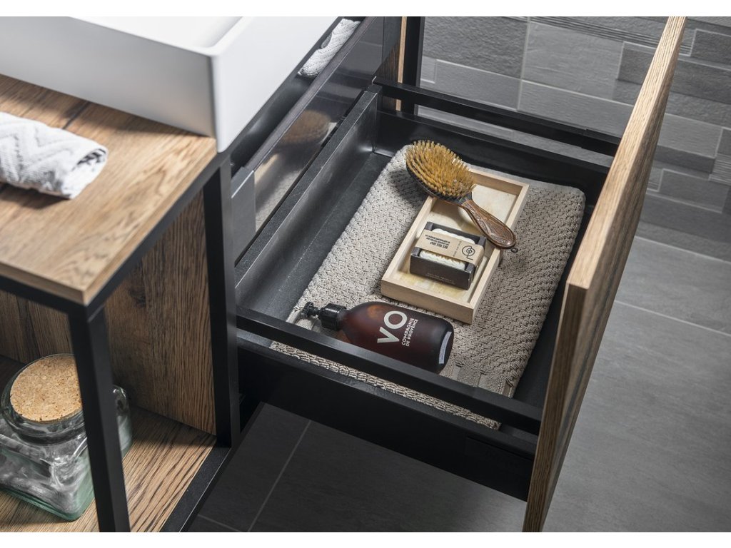 Hliníkové konstrukce pod umyvadlo s integrovanou zásuvkou - to je SKARA. Profily konstrukce jsou lakované na matně černou, doplňující zásuvka je vyrobena z lamino desek v dekoru dub Collingwood nebo dub Alabama. Zásuvka je bezúchytková, čímž je podtrhnut svěží design umyvadlové konstrukce. Samozřejmostí je Soft close systém automatického dovírání zásuvky, který zajišťují výsuvy BLUM.