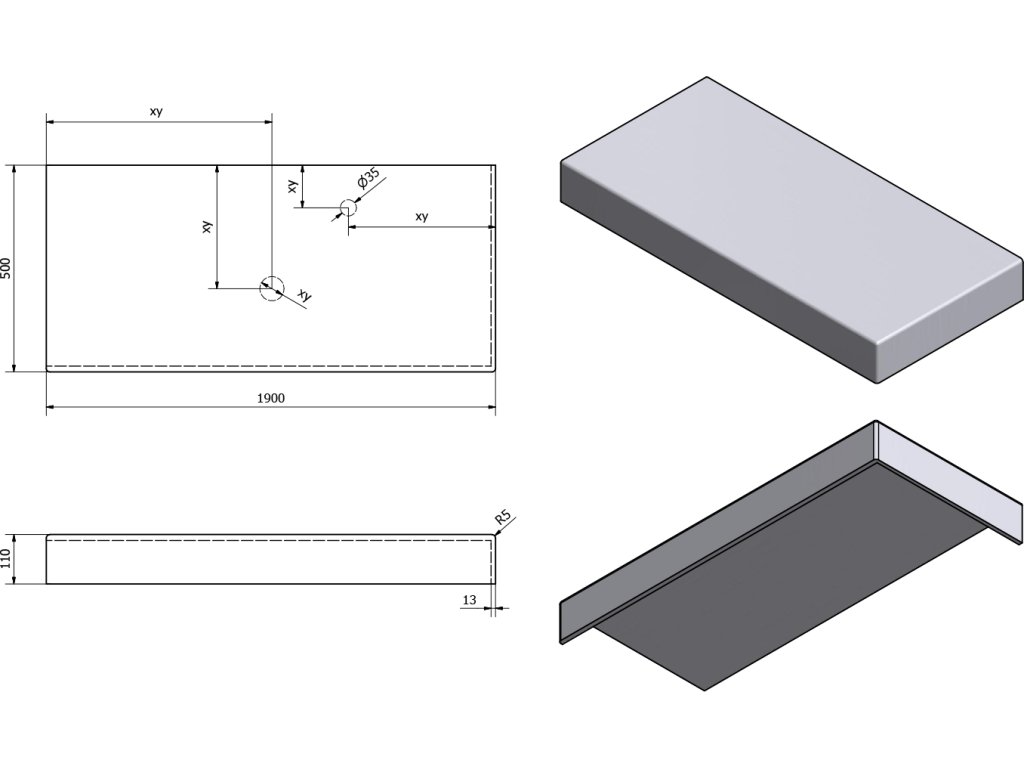 - Možnost dodání s otvory pro baterii a odpad dle výkresu (lze vrtat i v místě instalace)
