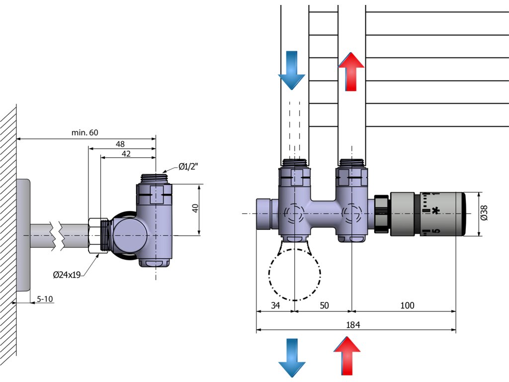 Kombinované připojení umožňuje ohřívat těleso jak centrálním systémem vytápění, tak využít pro samostatný ohřev elektrickou topnou tyč mimo topnou sezonu. Topnou tyč doporučujeme se stejným nebo podobným výkonem dle specifikace daného topného tělesa.
