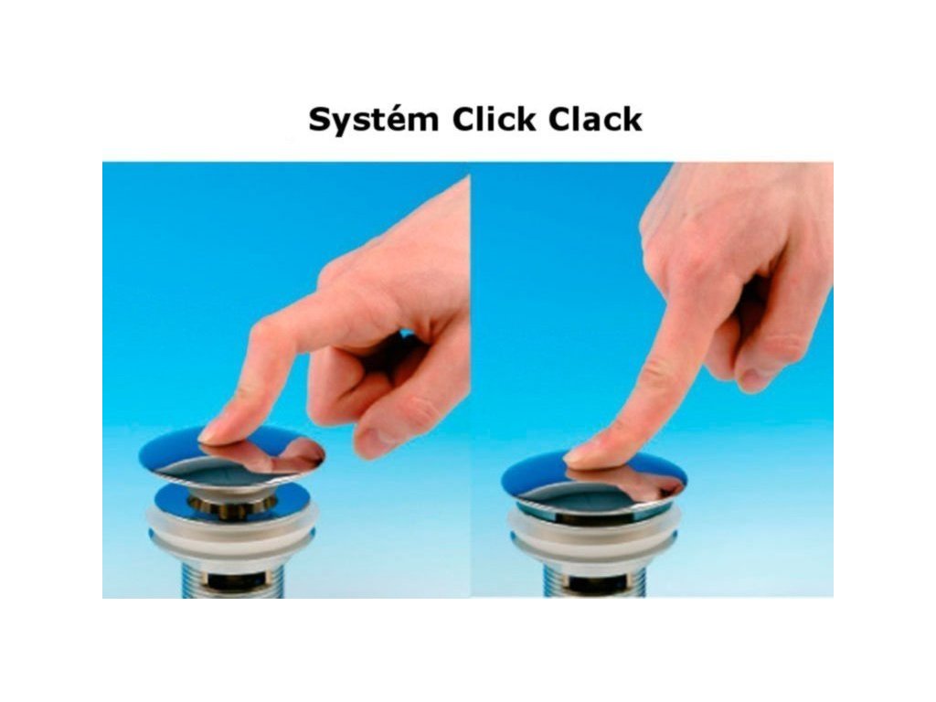 Jedná se o moderní variantu mechanismu uzavírání výpustí do umyvadel a van. Již nemusíte přemýšlet, kam odložit gumovou zátku, nebude překážet řetízek, odpadne nepohodlné ovládání zátky pomocí táhla u baterie. Systém Click Clack je ovládán pouhým stlačením zátky.