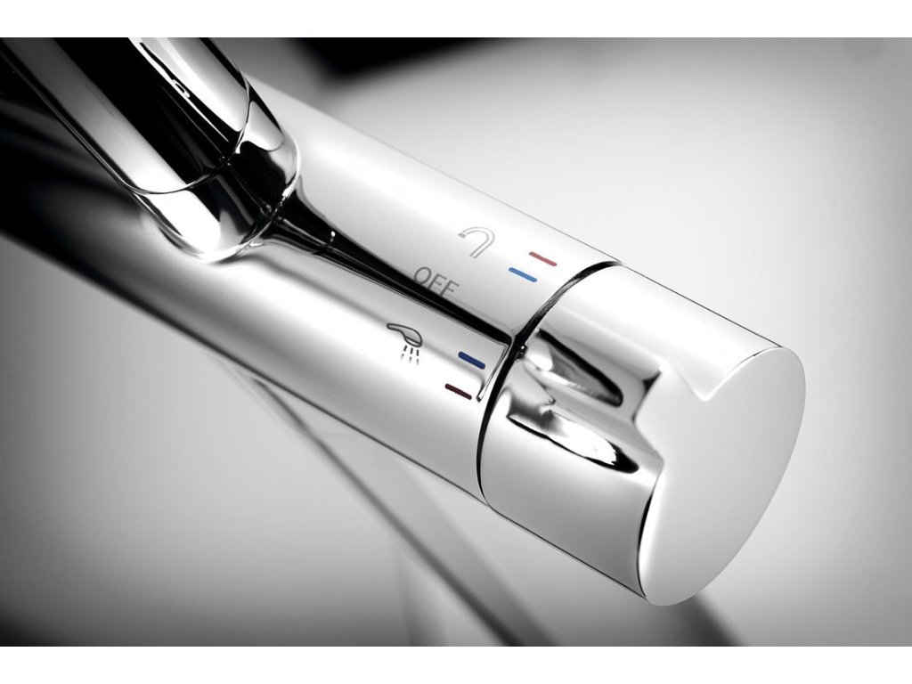 Princip progresivní kartuše: Otáčením rukojeti se spouští nejprve studená voda, ke které se postupně přidává voda teplá.