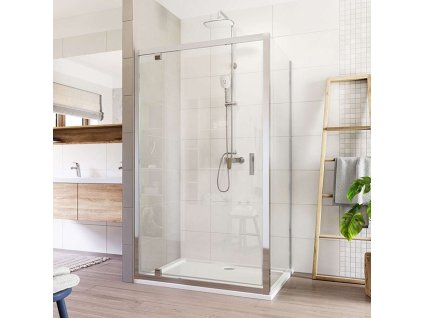 Hliníkové profily v barvě chrom, pivotové jednokřídlé dveře a pevný díl, sklo Čiré, síla skla 6 mm, obdélník, 1000 (dveře) x 900 (pevný díl), výška 1900 mm.