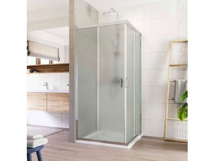 Hliníkové profily v barvě chrom, zasunovací dveře a dva pevné díly, sklo Point, síla skla 6 mm, obdélník, rozměr 900x1100x900 mm, výška 1900 mm.