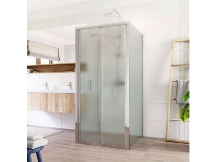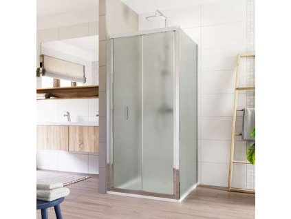 Hliníkové profily v barvě chrom, zalamovací dveře a dva pevné díly, sklo Point, síla skla 6 mm, čtverec, rozměr 900x900x900 mm, výška 1900 mm.