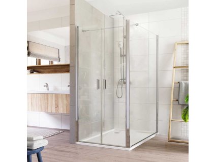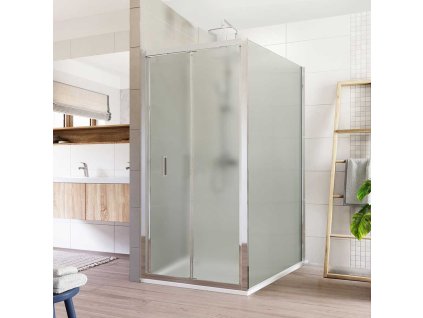 Hliníkové profily v barvě chrom, zalamovací dveře a dva pevné díly, sklo Point, síla skla 6 mm, obdélník, rozměr 1000x800x1000 mm, výška 1900 mm.