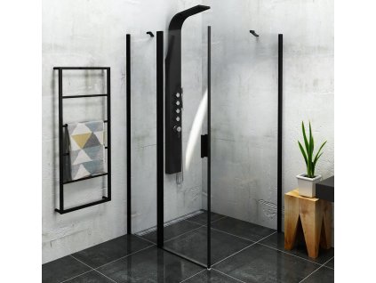 Hliníkové profily v barvě chrom, lítací dveře a pevný díl, sklo Čiré, síla skla 6 mm, čtverec, 800 (dveře) x 800 (pevný díl), výška 1900 mm.