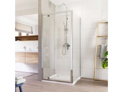 Hliníkové profily v barvě chrom, pivotové jednokřídlé dveře a pevný díl, sklo Čiré, síla skla 6 mm, čtverec, 900 (dveře) x 900 (pevný díl), výška 1900 mm.