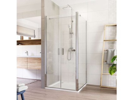 Hliníkové profily v barvě chrom, lítací dveře a pevný díl, sklo Čiré, síla skla 6 mm, čtverec, 900 (dveře) x 900 (pevný díl), výška 1900 mm.