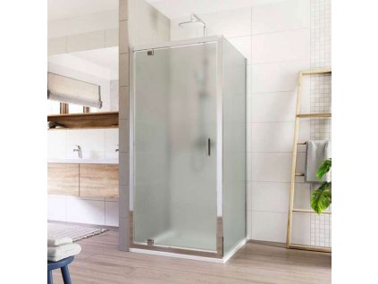 Hliníkové profily v barvě chrom, pivotové jednokřídlé dveře a pevný díl, sklo Point, síla skla 6 mm, čtverec, 900 (dveře) x 900 (pevný díl), výška 1900 mm.