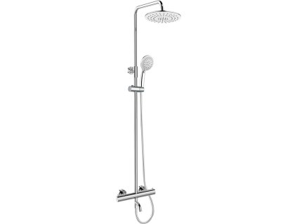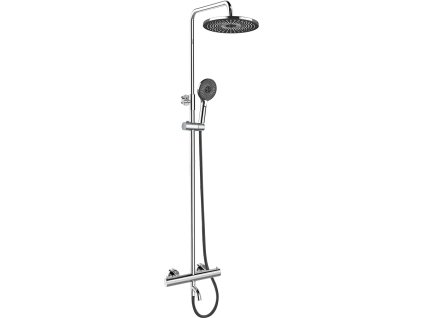 Termostatická nástěnná vanová baterie 150 mm, s nastavitelnou teleskopickou tyčí, nerezovou sprchovou hadicí 150 cm, ruční a talířovou kulatou sprchou, slim, ø 200 mm, nerez.
