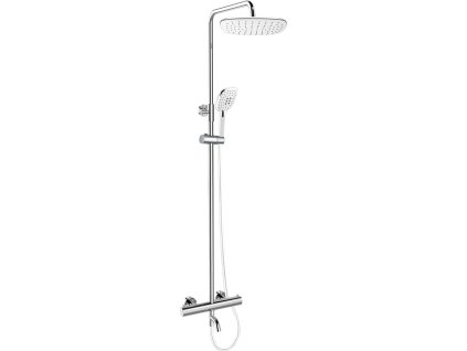 Termostatická nástěnná vanová baterie 150 mm, s nastavitelnou teleskopickou tyčí, bílou sprchovou hadicí 150 cm, ruční a talířovou hranatou sprchou, 300x190 mm, bílá