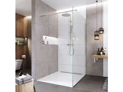 Hliníkové profily v barvě chrom, sklo Čiré, síla skla 8 mm, WALK IN, rozměr 900 mm, výška 2000 mm.